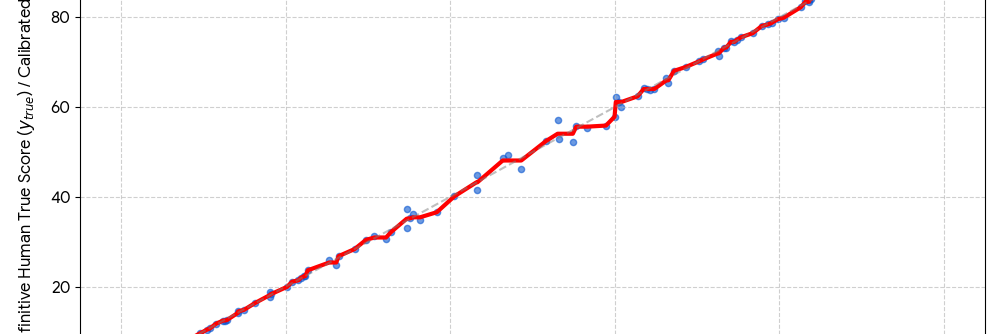 The test of a robust calibration is in the results. The chart below shows what a successful output looks like: blue dots are individual scripts, the red line is the AI’s calibrated scoring curve, and the proximity to the grey 1:1 line is direct evidence of fairness and fidelity to expert standards.