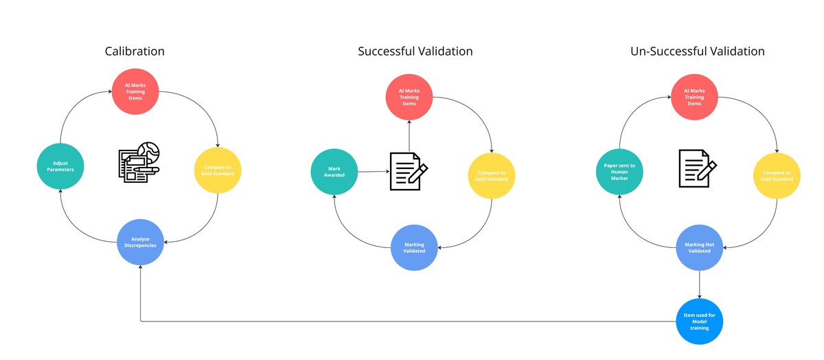 With calibration achieved, each new batch of assessments follows the validation journey. If the AI’s mark aligns with the gold standard, the score is awarded automatically (successful validation). When a discrepancy surfaces, that script is routed for human review and the insights are also used to further refine the model. This ensures that no “difficult to score” item is lost or ignored—the system learns and improves each time.