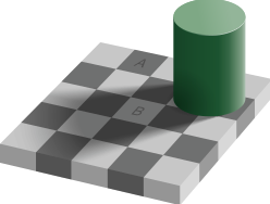 The Illusion: Look at square A and square B. Square A looks dark grey. Square B looks white (in a shadow). The Reality: They are exactly the same shade of grey. (If you don't believe us, cover the middle of the image with your finger).