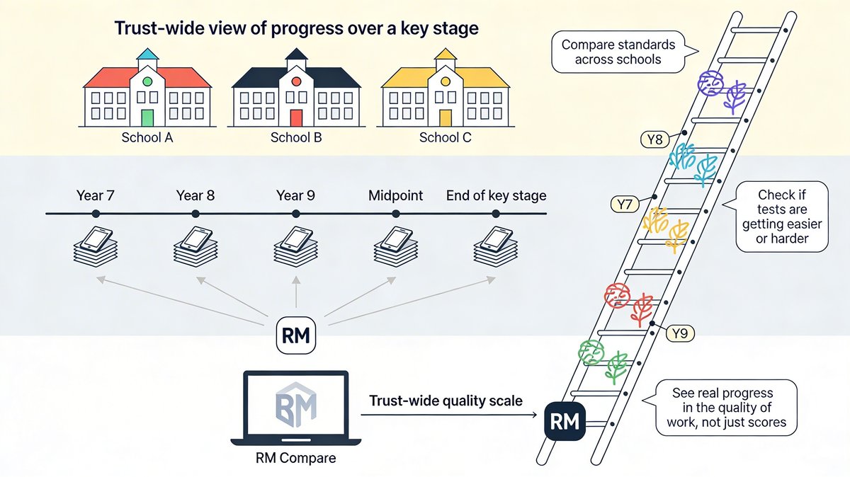 Across a group of schools, curriculum leaders can use the same approach to ask whether they are genuinely expecting the same standard of writing or project work in a particular year group. Cross‑school RM Compare sessions on samples of pupil work let them see how pieces from different schemes of learning, or different schools, line up on a shared standard – and adjust curricula accordingly.