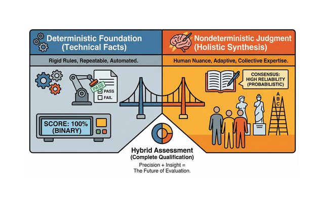 In a previous post, we explored the "Three Mirrors" of assessment - the Left, Right, and Centre views that together provide a complete picture of learner performance. Today, we want to look deeper into the glass. Specifically, we want to discuss why the "Left Mirror" (Holistic Assessment) works so differently from the "Right Mirror" (Absolute Assessment), and why the future of high-stakes evaluation is becoming more nondeterministic.