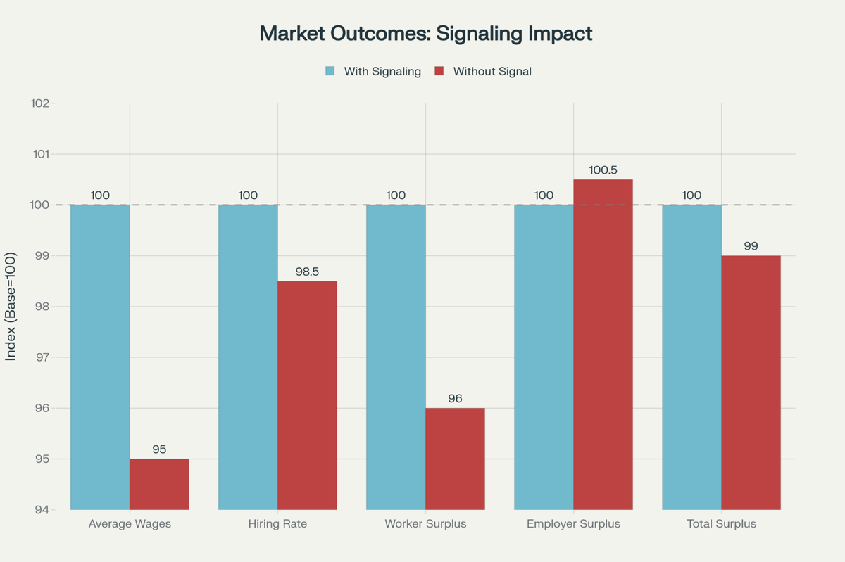 The efficiency cost of losing signals: workers bear the burden with 5% lower wages and 4% less surplus, while total market surplus falls 1%.