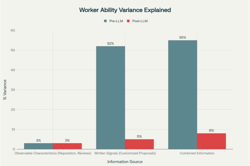 Observable characteristics like on-platform reputation and reviews explain only 3% of actual ability variation. Written signals, by contrast, explained 52% of ability variance in the pre-LLM period. After LLM adoption, written signals explain only 5% - leaving employers nearly blind to worker quality.