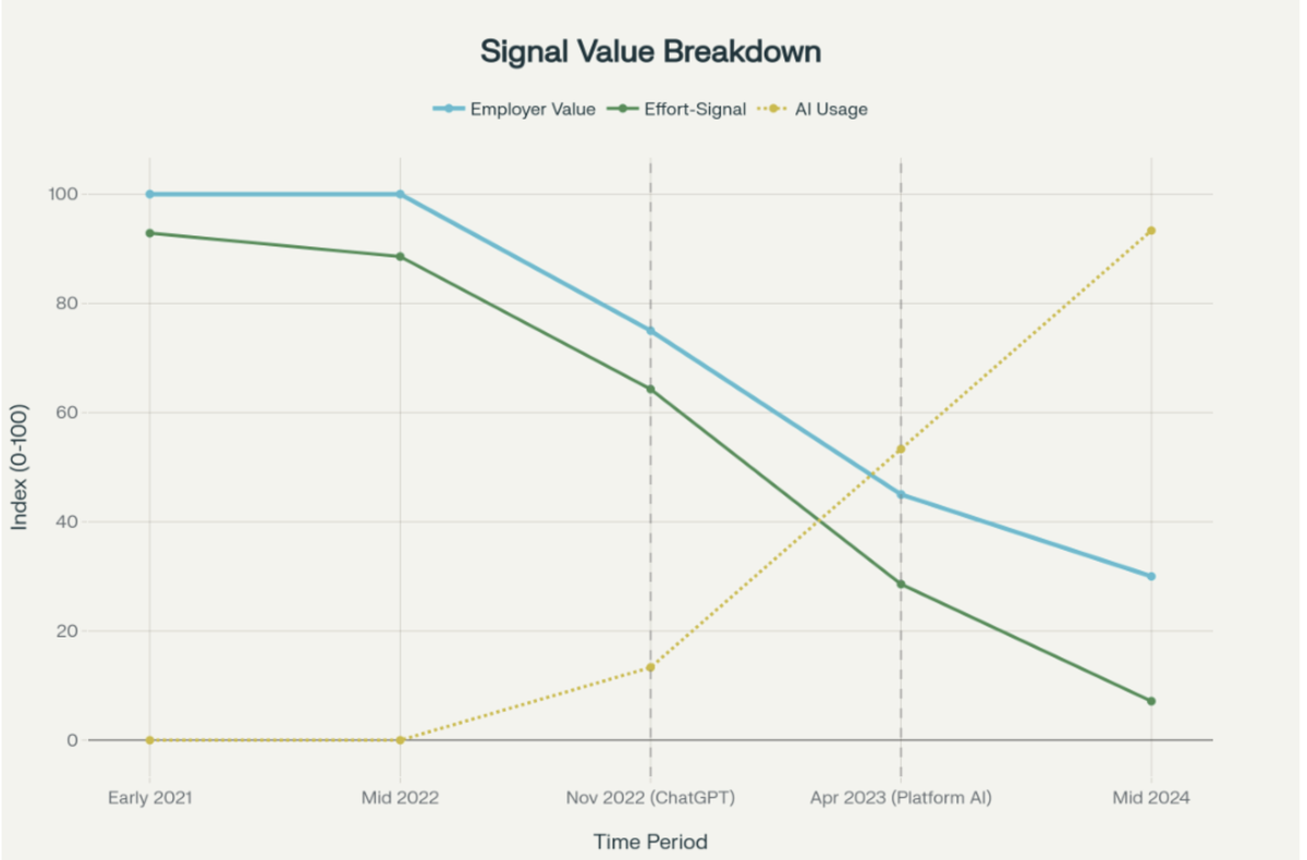 As AI adoption rises, employer value of signals plummets and the effort-signal relationship breaks down.